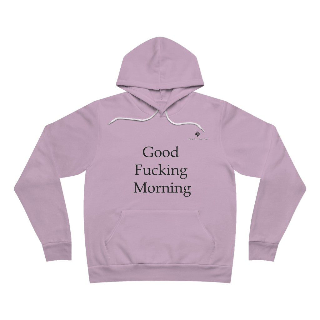 The unisex sponge fleece pullover hoodie is a blend of Airlume cotton and polyester. The percentages vary according to color. A pouch-style pocket spreads across the lower half of the garment’s front. The hood can be tightened with a white drawcord. Both cuffs and waistband have ribbing for extra grip.